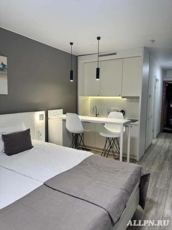 Студия полностью меблирована и укомплектована всей необходимой бытовой техникой, что позволяет комфортно проживать или сразу сдавать в аренду.